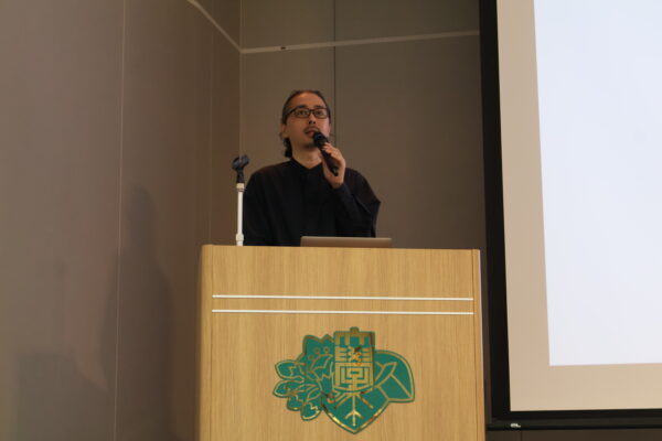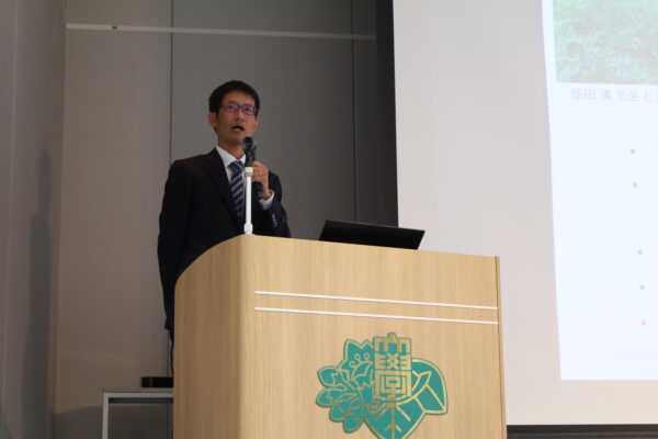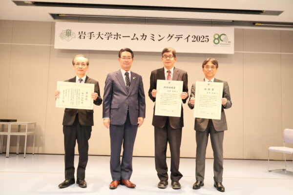 続いて、教育学部1号館の北桐ホールでは記念式典を開催。創立80周年事業の進捗報告や感謝状の贈呈に加え、農学部・渡邉学准教授による研究紹介「リンゴ『はるか』の育成から普及まで」、教育学部卒業生で合同会社ホームシックデザイン代表の清水真介氏による記念講演「クリエイティブの力でこの地を開墾する〜岩手大学生の起業から20年〜」が行われました。